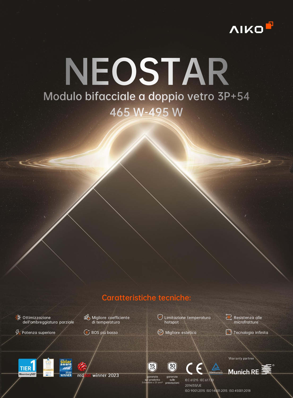 The AIKO Neostar 3P+54 is a third-generation (Gen 3) high-end photovoltaic panel featuring N-Type ABC (All-Back-Contact) technology.