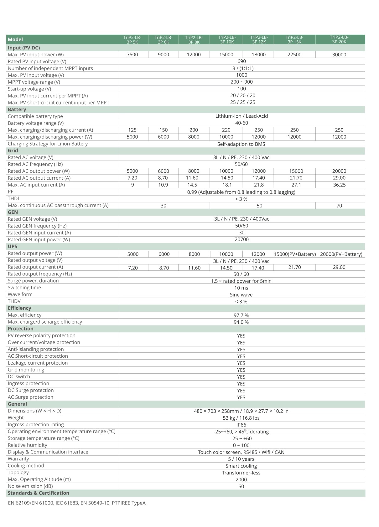 • Conformità alla rete: la serie TriP2-LB-3P 5-20K è certificata per l’uso nelle reti europee, certificazione CEI-021 in corso, prevista per Gennaio 2026