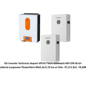 Scegli Questo prodotto ha più varianti. Le opzioni possono essere scelte nella pagina del prodottoQuick ViewAxpert VM II III IV, Inverter, Inverter ad Isola (Off-Grid), Kit Inverter + Batteria, LuxPower/Hinaess, Off-GridKit Voltronic Axpert VM III TWIN 6000watt 48V Off-Grid Inverter e 2 batterie Luxpower PowerGem Wall da 5,12 kw al litio – 51,2 V (tot. 10,24Kw)